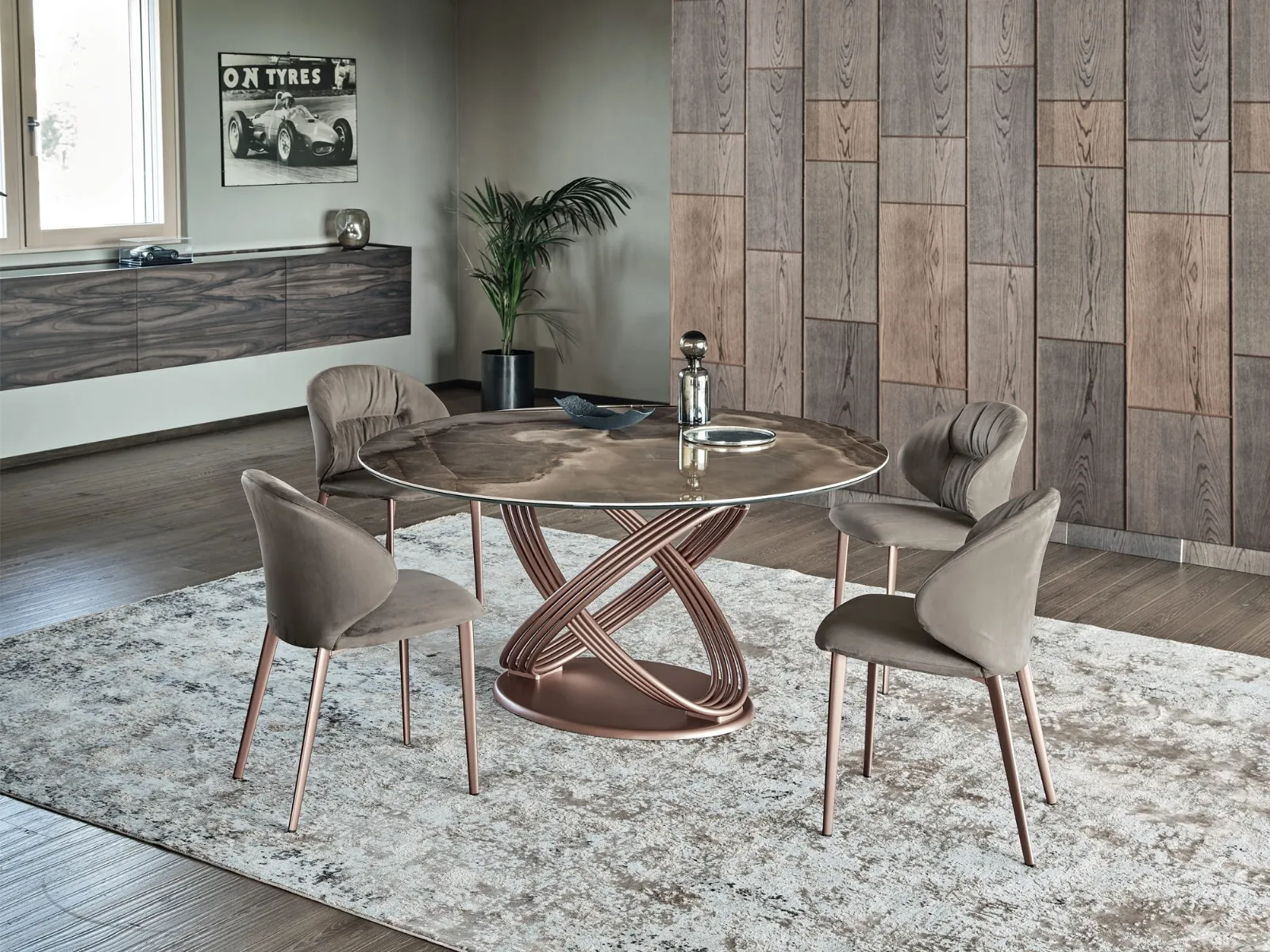 Se vuoi un tavolo da pranzo di alto contenuto estetico, contattaci e ricevi info e preventivi sul modello visibile in foto. Ideali per dare vita a degli abbinamenti unici con sedie e complementi design, i Tavoli fissi dell'azienda sono soluzioni tra le più originali in commercio, ideali per il living e la zona cucina. Tavolo Fusion Rotondo di Bontempi: realizzato in materiali pregiati è caratterizzato dalle linee decise del top e da un basamento ricercato ed elegante. Il noto e conosciuto brand Bontempi, leader nella realizzazione di arredi in gres, ha scelto per la sua collezione una grande varietà di materiali, linee e tonalità.